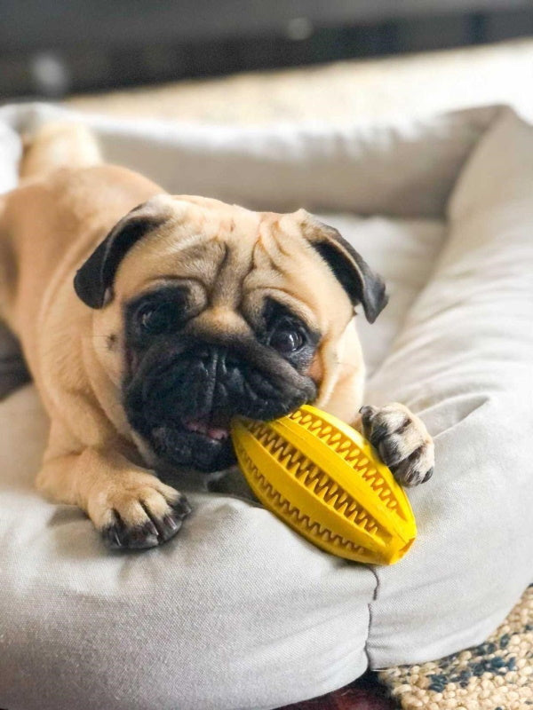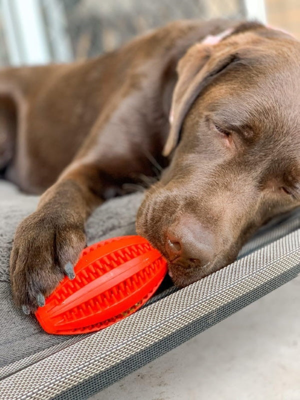 This Enrichment Treat Football, is a fun interactive ball for your dog. Made of non-toxic rubber, this football is great for playtime and keeping your dog mentally stimulated.